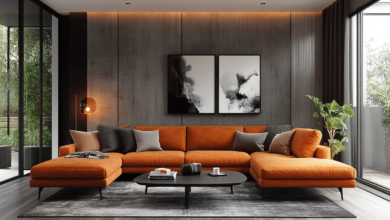 Complementary décor elements such as sleek glass coffee tables and monochromatic artwork elevate the room’s chic vibe. Incorporating greenery softens the intensity, introducing a refreshing natural contrast that enlivens the space.