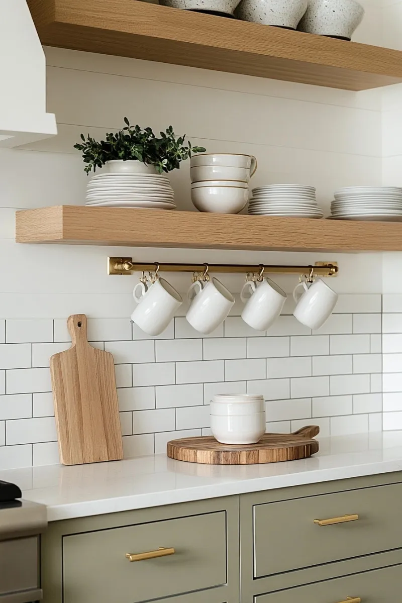 Floating wood shelves bring an inviting warmth to any kitchen, especially when paired with neutral backsplashes like white subway tiles. The natural grain of wood contrasts beautifully with sleek, modern surfaces, creating a harmonious blend of cozy and contemporary vibes.