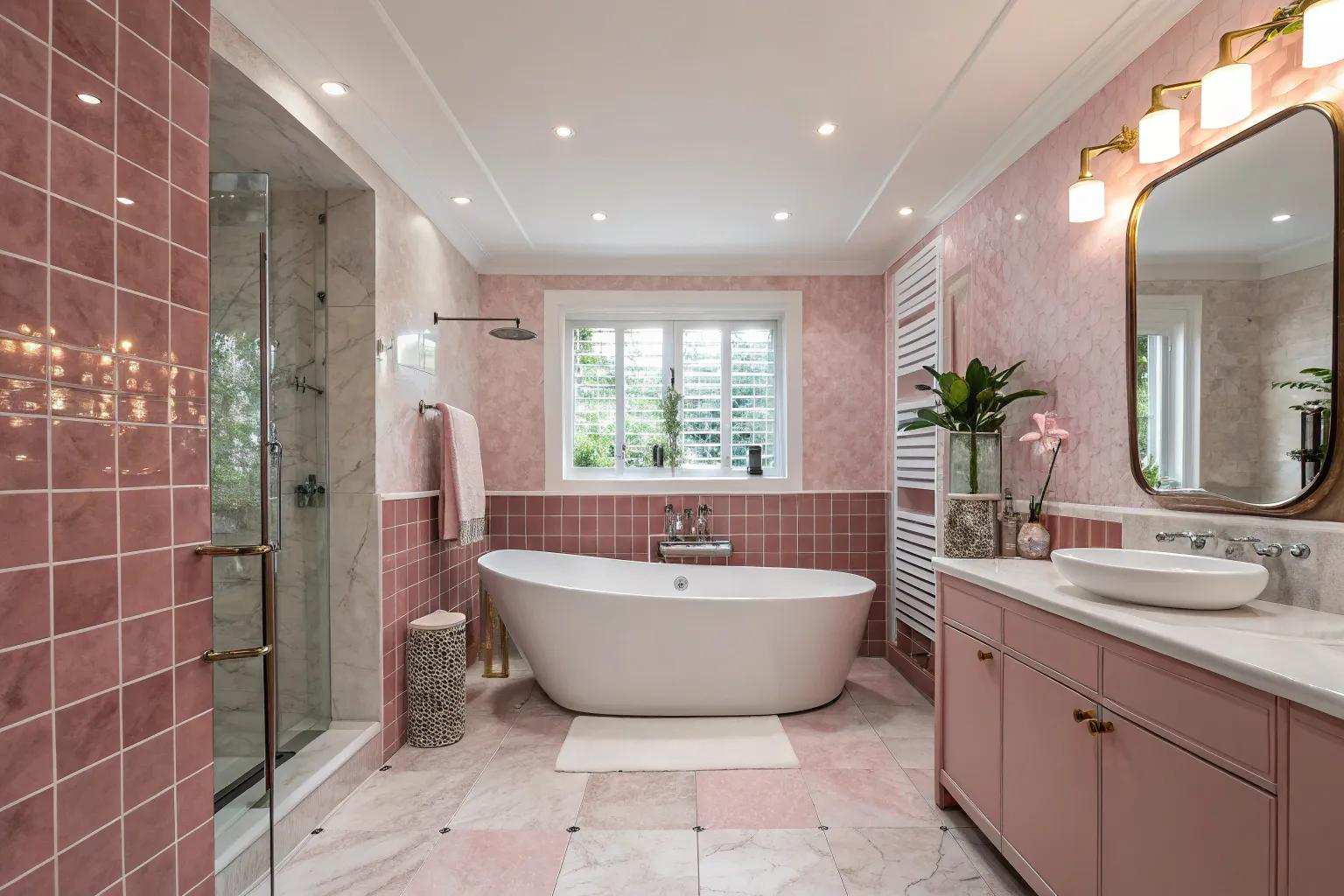 Integrating pink tiles with geometric designs can inject a playful yet refined element into your bathroom. This combination creates a captivating centerpiece that draws attention without overpowering the room.