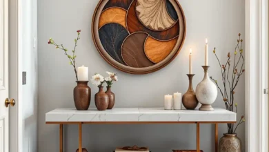 One striking idea is a sunburst or radiating pattern behind a focal piece. Pair warm gold or ochre tones with a white or sage backdrop, and complement with natural wood furniture, a geometric-patterned rug, and matte black or brass hooks. Minimal accessories like a vase or key dish keep the area functional without overcrowding.