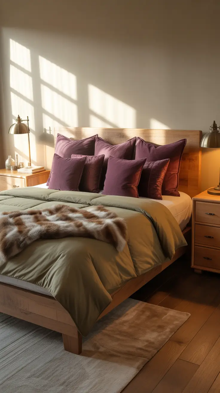 Introduce tufted comforters or knitted throws in burnt orange or plum velvet for softness and contrast.