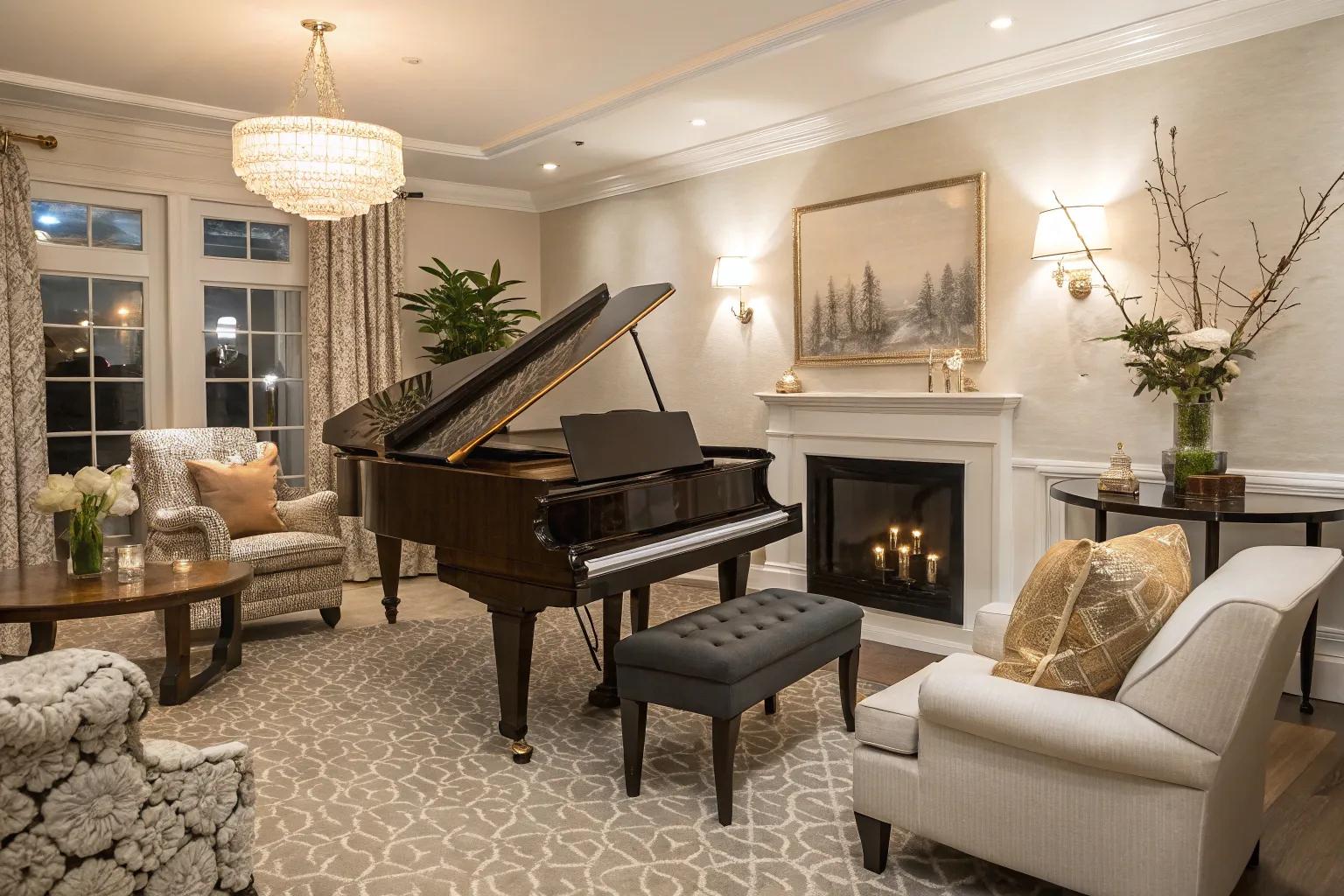 • Chic Chandelier Lighting: Add a luxurious chandelier above your piano to create a warm, inviting glow that accentuates its elegance.
