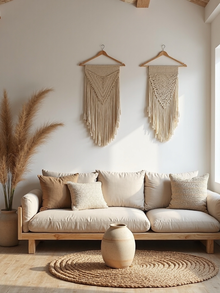 Hang a macramé wall piece above your sofa to introduce artisanal texture. Scatter velvet cushions and chunky knit throws across seating areas for tactile comfort. Incorporate woven baskets and rattan furniture to bridge minimalist structure with bohemian warmth seamlessly.