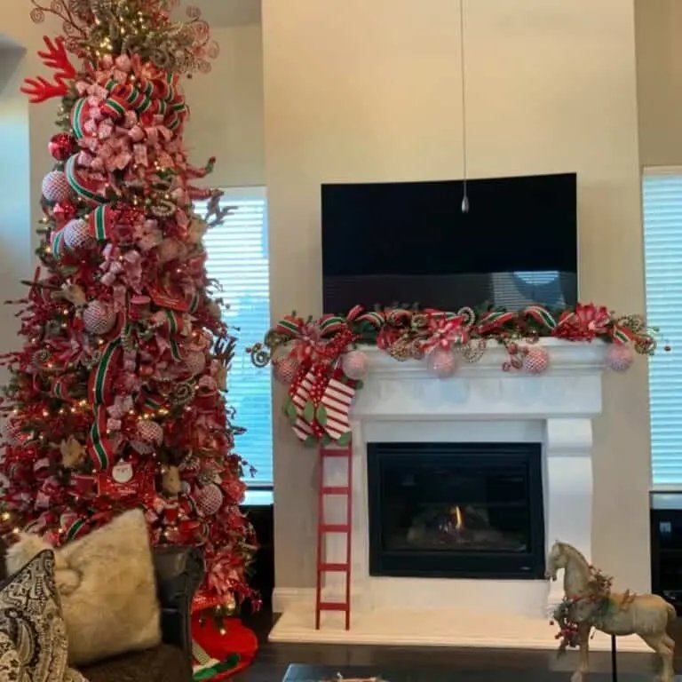 Coordinating your tree’s ribbon with mantel garlands creates a seamless holiday aesthetic that flows beautifully throughout your living space. Opt for a red ribbon that perfectly complements your mantel’s garland hues.