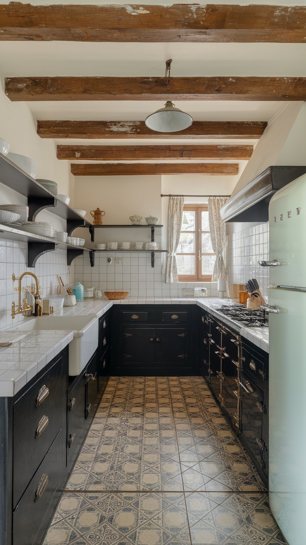 This rustic kitchen combines black cabinetry and white tiles with natural wood beams and patterned floor tiles, creating a warm and inviting atmosphere. Golden fixtures and open shelving displaying pottery add charm and functionality.