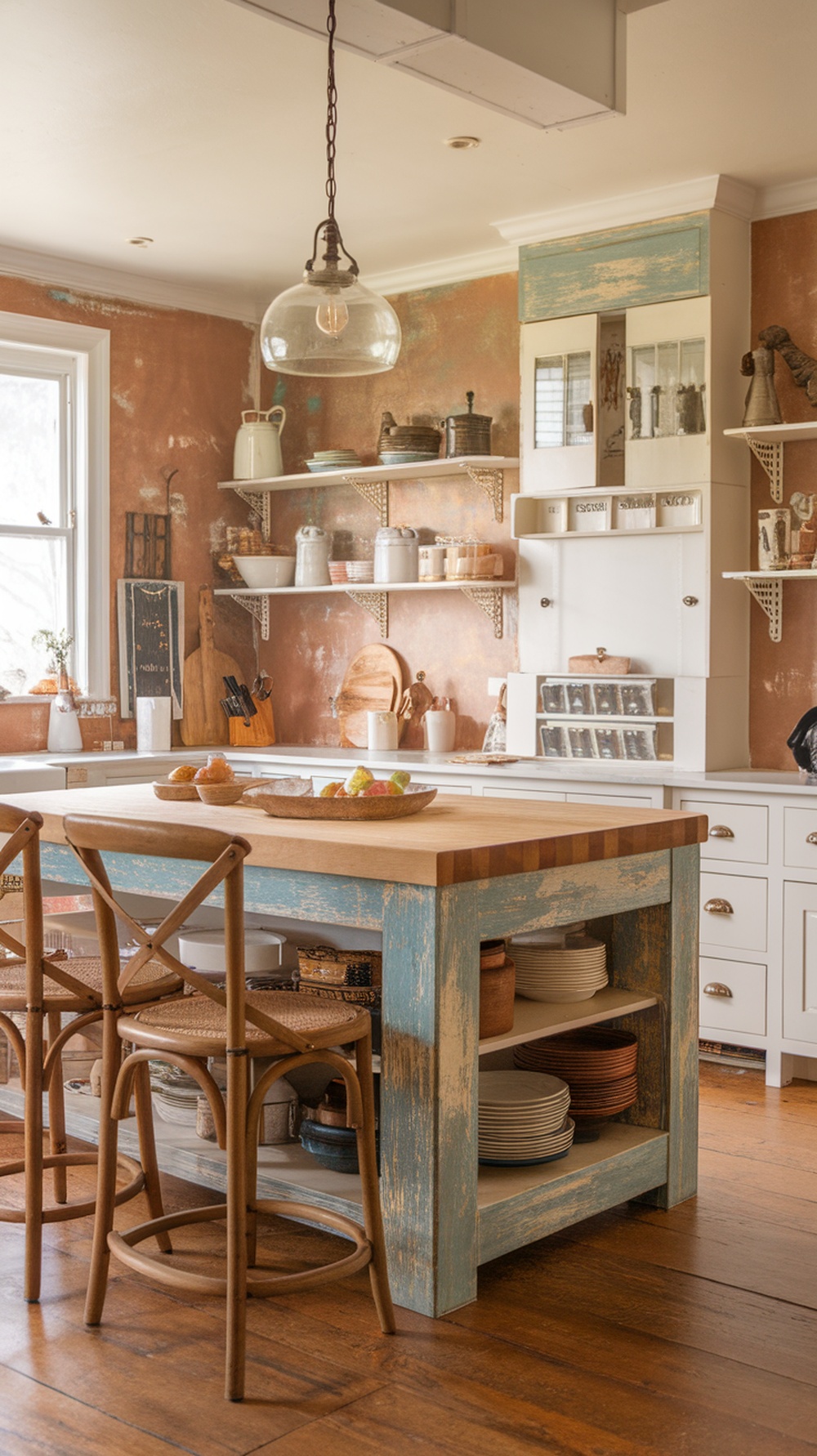 Incorporating open storage into a rustic island allows you to showcase cherished dishware or unique utensils. Complement this with warm pendant lighting to create an inviting and functional space.