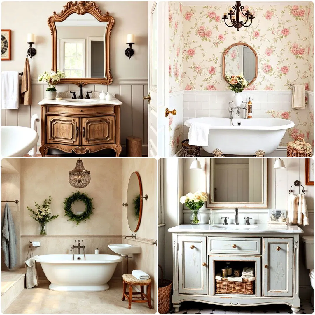 - Rustic Sophistication: French country bathrooms combine weathered wood, vintage porcelain, and antique fixtures for a charming yet elegant look.