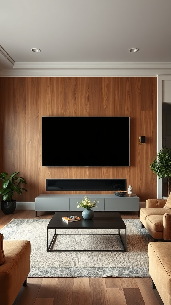Wood-paneled accent walls can dramatically redefine your living room’s ambiance. The example highlights rich, dark wood panels serving as a warm, textured backdrop for a sleek TV setup.