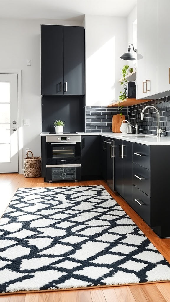 A stylish rug can add warmth and personality to a black and white kitchen. Bold geometric patterns in monochrome hues complement cabinetry and backsplashes, creating a cohesive and inviting look. Beyond aesthetics, rugs provide comfort underfoot, enhancing the cooking and gathering experience.