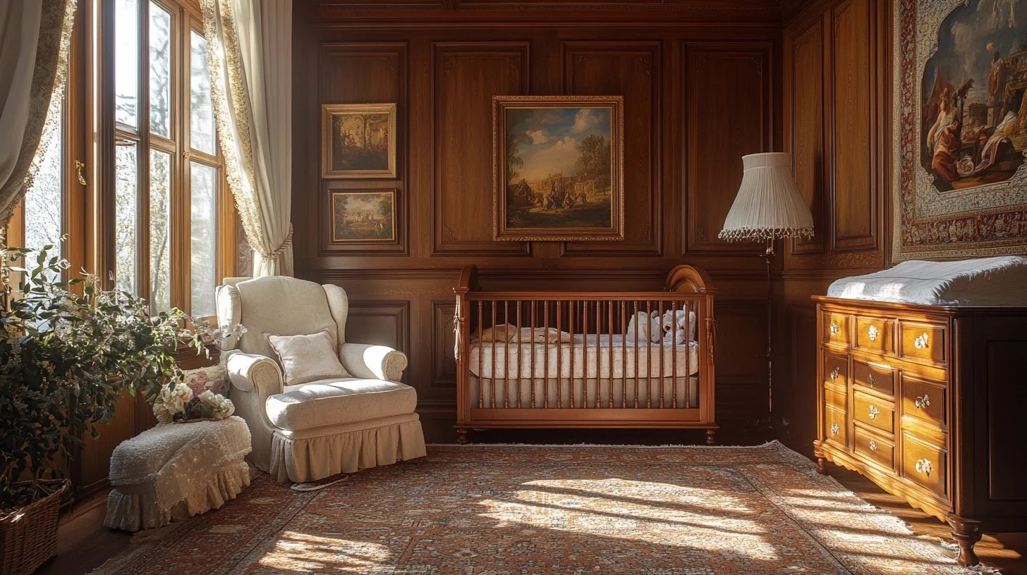 Merge antique furnishings, rich wood tones, and heritage décor to create a warm and meaningful nursery. Vintage rocking horses and family portraits beautifully connect past traditions with today’s comfort.