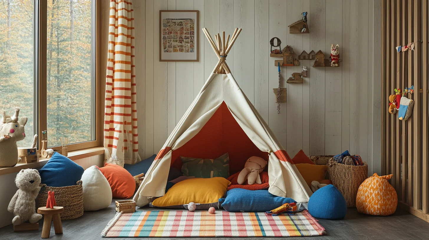 Childhood delight shines through in a kids’ corner styled with little cabin decor. Wooden toys, vibrant fabrics, and soft rugs create a cheerful yet timeless space. This whimsical design nurtures imagination and joy, where laughter naturally fills the warm, inviting room.