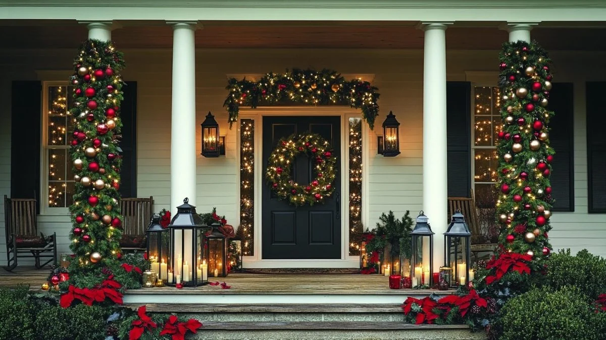 Elevate your porch with garlands draped elegantly along staircase railings, accented with ribbons and twinkling lights. Add large ornaments and sophisticated wreaths for a polished finish. This decor style adds grace and charm to your holiday entrance.