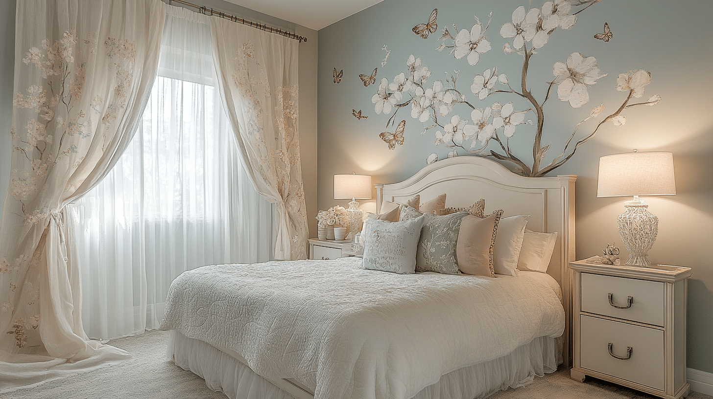 Step into the Butterfly Garden Sanctuary, a tranquil space adorned with delicate butterfly motifs and soft floral patterns. Pastel shades and ethereal décor, including a canopy bed with sheer curtains, create a calming retreat. Gentle lighting enhances the peaceful ambiance, making it an ideal haven for rest and reflection.
