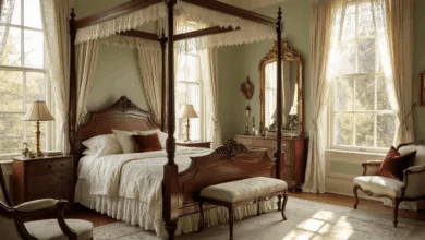 Adopt a cozy cottage vibe with floral wallpaper, handmade quilts, and rustic wooden furniture. This style harmonizes with the attic’s quaint charm, creating a warm and inviting atmosphere.