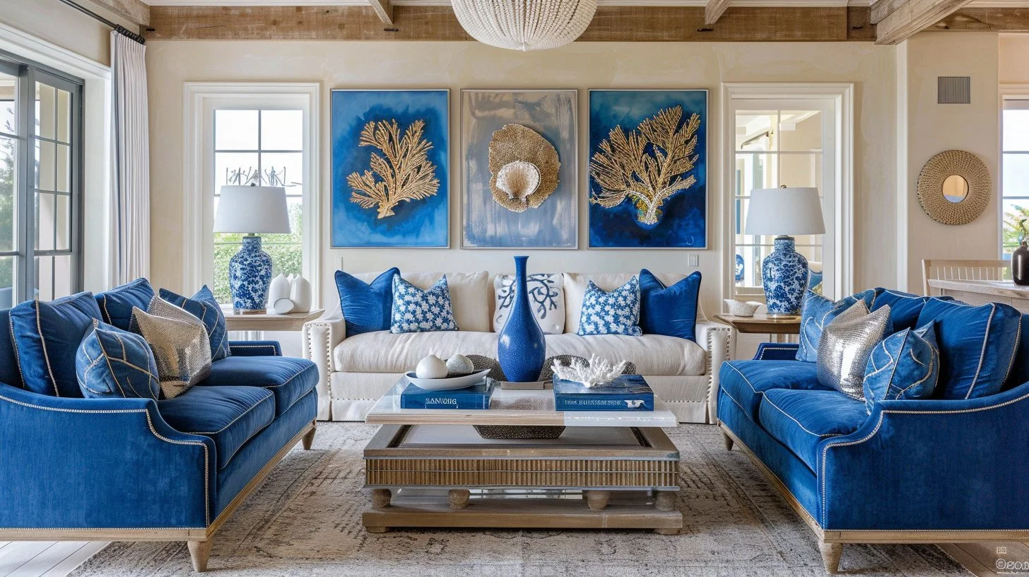 Inspired by tropical lagoons, this living room features vibrant blues and greens contrasted with white and sandy hues. Contemporary, comfortable furnishings encourage relaxation, while accents like watercolor lagoon paintings and glass vases filled with blue and green marbles add playful color. This lively yet soothing space is perfect for families or anyone who enjoys the energetic side of coastal living.