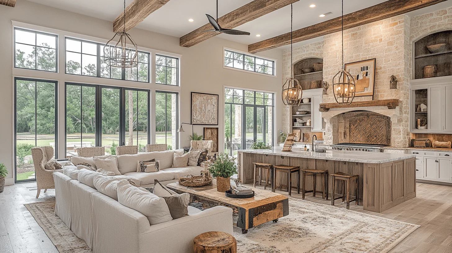 The blend of rustic textures with sophisticated finishes defines the rustic-chic farmhouse style. Exposed timber beams and stone accents coexist with luxurious elements like leather seating and polished marble countertops. This juxtaposition creates a space that feels both grounded and refined, offering a cozy yet upscale atmosphere. It’s an excellent choice for homeowners who desire a balance between comfort and elegance in their living spaces.