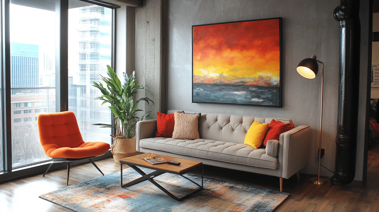 Capture the vibrancy of city life with an Energetic Urban Living space. Bold artwork and reflective surfaces combined with modular, affordable furniture create a dynamic and stylish environment that resonates with metropolitan energy.