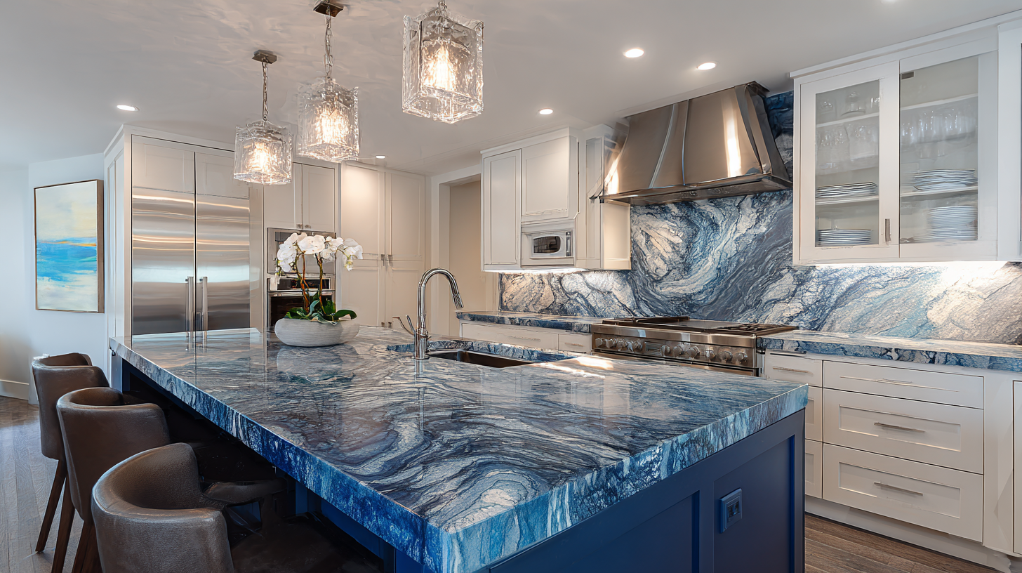Bring the calming essence of the sea into your home with Oceanic Blue granite countertops. The rich blue swirls mimic the gentle movement of ocean waves, transforming your kitchen or bathroom into a peaceful sanctuary. These countertops shine brilliantly against light-colored cabinetry, perfect for achieving a breezy coastal vibe.
