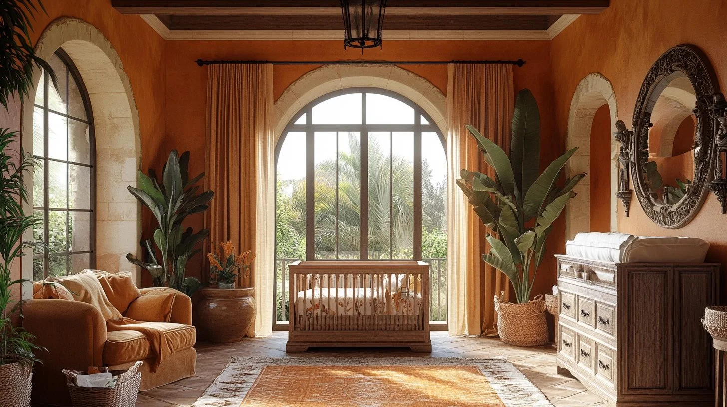 The Mediterranean Luxury Nursery incorporates terracotta floors, stucco walls, and wrought iron details, creating an elegant, rustic atmosphere. Earthy tones and Mediterranean-inspired decor bring a sunny, romantic charm to the room.