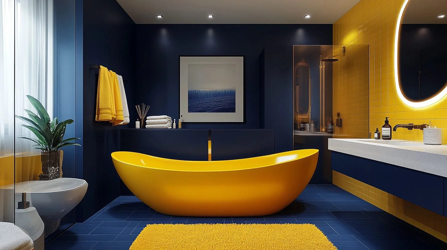 For a bold and refined aesthetic, deep navy walls create a dramatic canvas that allows bright yellow accessories-like bath mats, towels, and soap dispensers-to pop vividly. This palette is ideal for those who favor a striking yet elegant interior. Pairing this with chrome or brushed nickel fixtures and minimalist furniture enhances the modern sophistication of the space. According to recent design trends, navy blue remains a top choice for creating timeless, luxurious bathrooms.