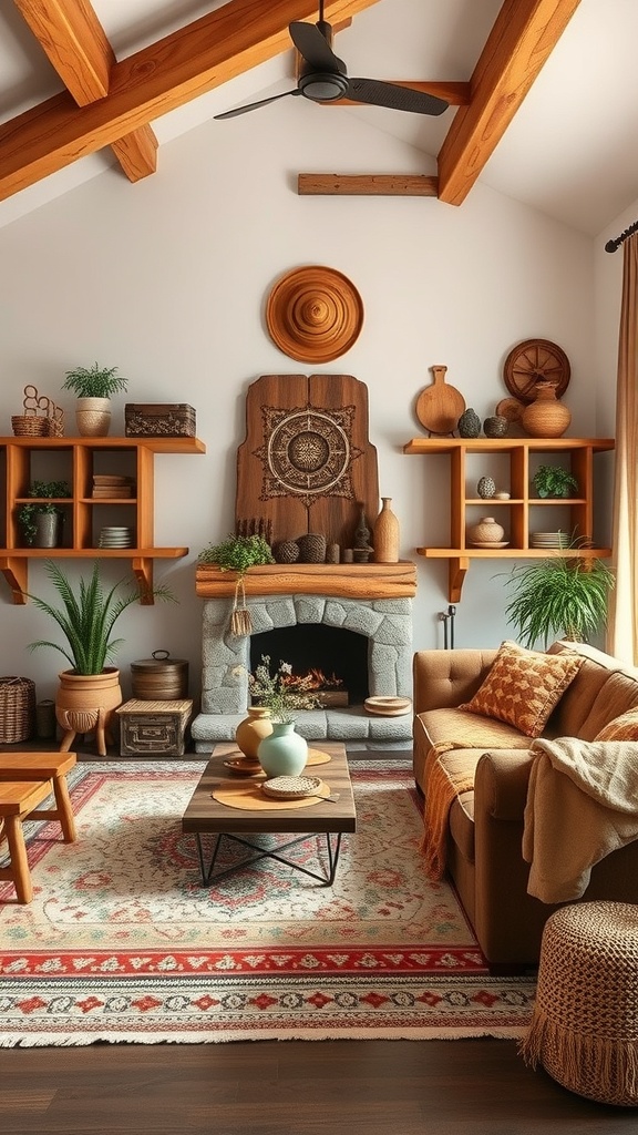 Wooden shelving units serve as both functional and decorative features, displaying an array of artisanal pottery, woven baskets, and other handcrafted items that add personality and texture. A central wooden coffee table anchors the space, harmonizing with the room’s earthy color scheme and providing a communal spot for socializing.