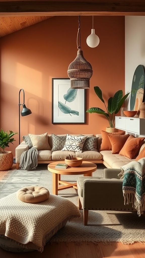 Layering diverse textures is key to crafting a cozy boho living room. Chunky knit blankets draped over sofas add warmth and tactile appeal, perfect for chilly evenings. A mix of pillows in various fabrics-ranging from smooth linens to nubby weaves-engages the senses and enhances visual interest.