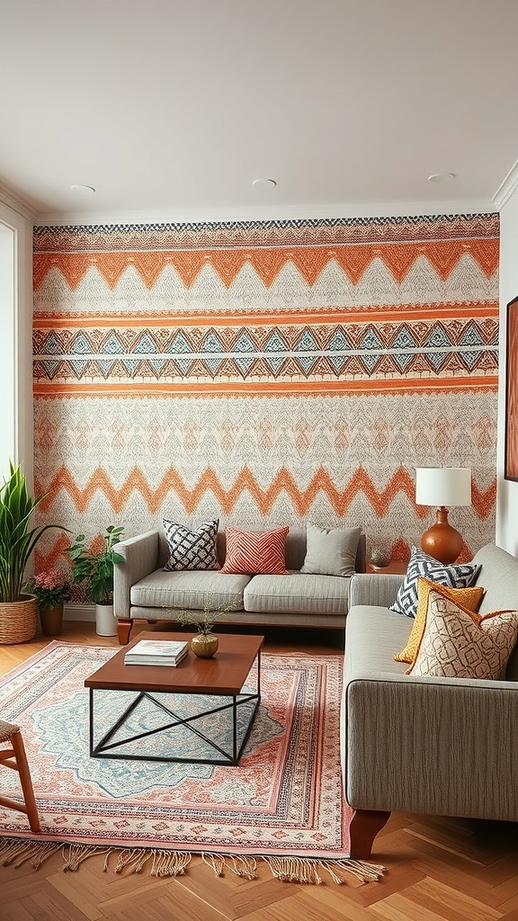 Wallpapered accent walls offer a striking way to infuse personality into a boho farmhouse living room. Earthy geometric patterns in warm hues like terracotta and soft blues create a cozy backdrop that complements simple, neutral furnishings.