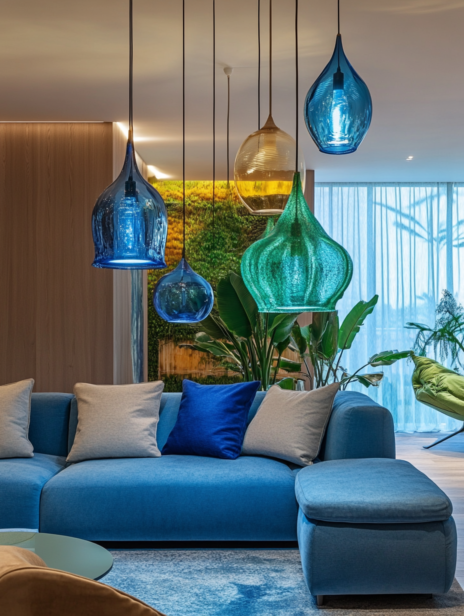 Lighting plays a pivotal role in setting the mood of your living room. Introduce blue and green hues via lampshades, pendant fixtures, or floor lamps to subtly infuse color. Opt for lighting solutions that combine ambient and task lighting to create a versatile and inviting atmosphere that adapts to your needs.