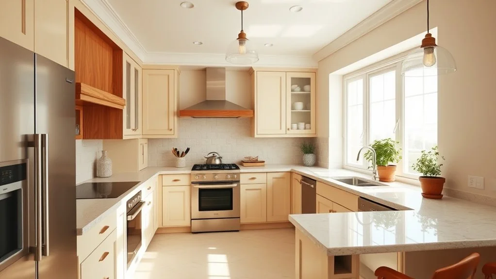 Soft beige cabinetry paired with streamlined hardware enhances natural light, creating an airy ambiance. Open shelving can be used sparingly to showcase select items, maintaining a tidy yet personalized feel.