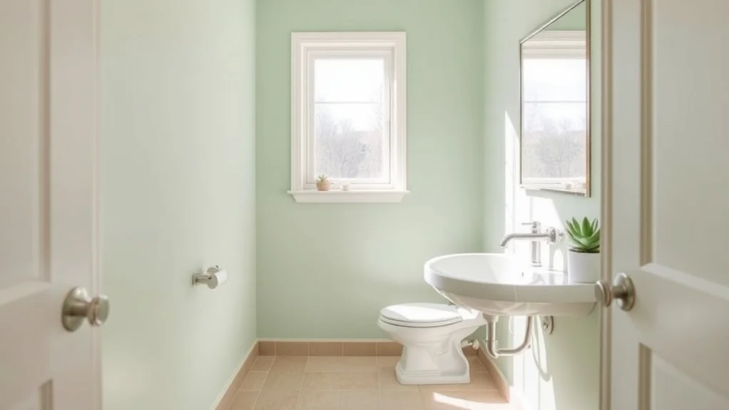 Light-colored cabinetry or shelving in cream tones enhances the airy feel, creating a harmonious environment ideal for relaxation. This palette transforms your small bathroom into a peaceful retreat that invites calm and comfort.