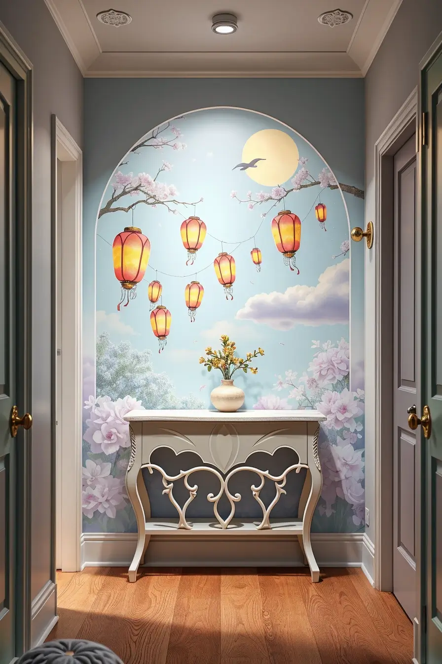One memorable project featured lanterns and a crescent moon painted on the ceiling and upper wall, delighting children who eagerly passed through the “magic hallway” each night. HGTV notes that playful murals add whimsy to corridors and entryways, sparking imagination.