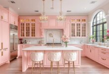 Bright and Airy Small Kitchen Islands with Pastel Toned Seating to Amplify Space and Softness