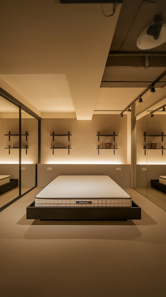Designing a basement bedroom without windows requires creative solutions to simulate natural light and maintain a cozy atmosphere. Begin with layered lighting: combine recessed ceiling fixtures, warm-toned LED sconces, and table lamps to eliminate harsh shadows. Choose light wall colors such as soft greige, pale blush, or off-white to visually enlarge the space. Reflective surfaces like glossy furniture and mirrored wardrobes help distribute light evenly.