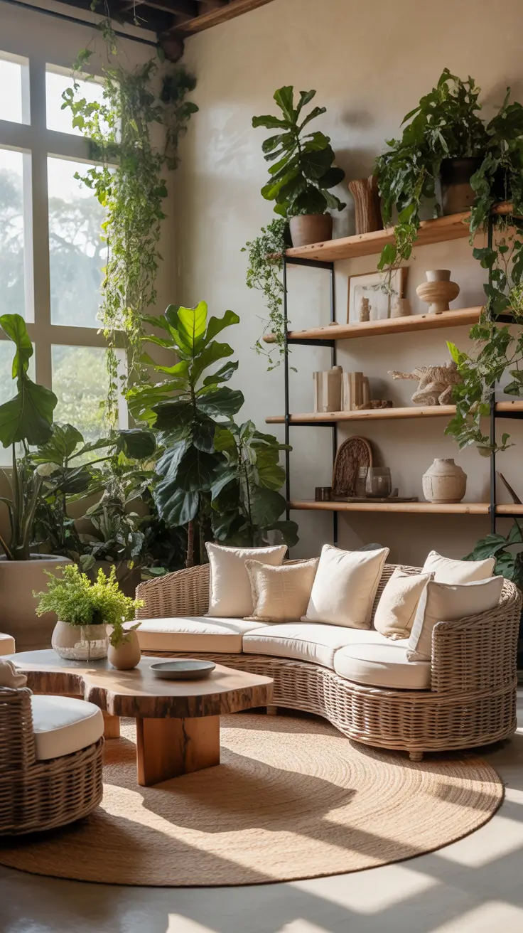 Start with neutral walls to let greenery take center stage-potted palms, vines, and monstera plants in woven baskets add life. Incorporate rattan furniture, bamboo shelving, and jute rugs for organic texture. Soft lighting from woven pendant lamps enhances the natural vibe. A palette of greens, browns, and creams unifies the look.