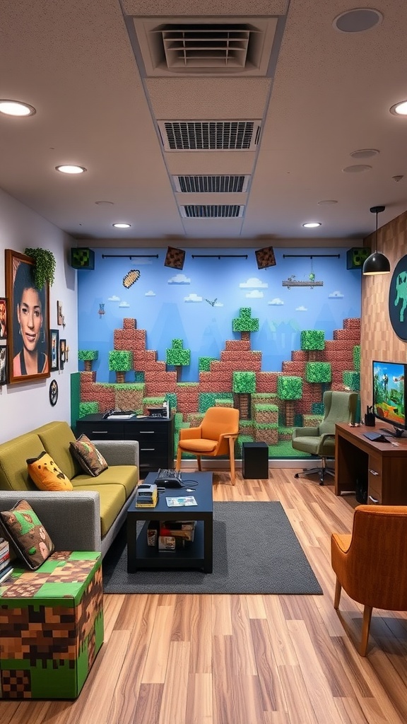 Give your living room a fresh twist by incorporating block-inspired furniture and pixelated textiles. Use green and brown tones to echo Minecraft’s natural biomes, creating a warm and inviting atmosphere. This style adds a distinctive character to your home, perfect for relaxing or entertaining guests. Enhance comfort with pixel-themed cushions that tie the look together.