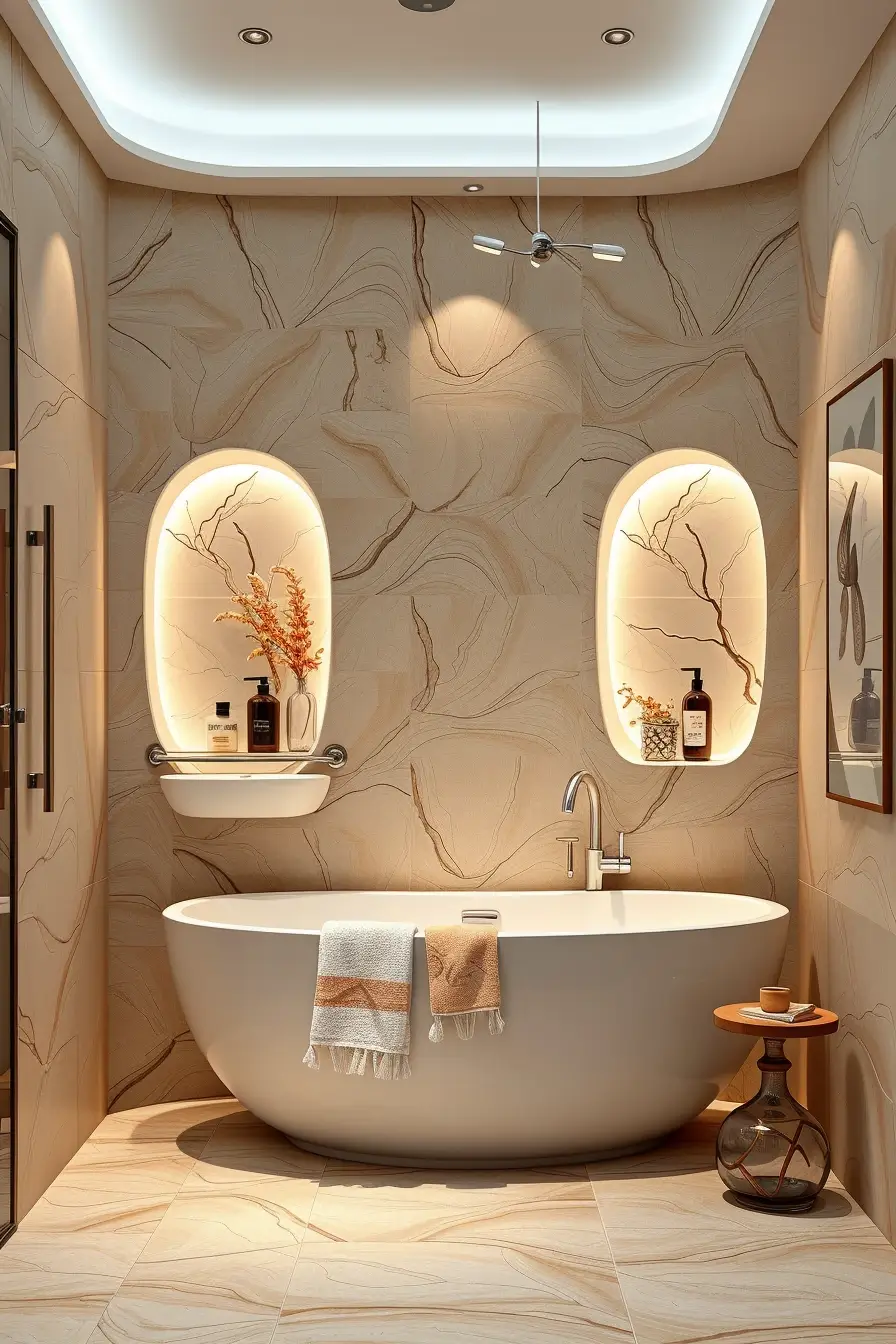 Framing niches with stone or matte tile highlights their curves. Concealed LED strips add depth and ambiance. Placing niches above tubs or in showers reduces clutter and showcases elegant design. In my own renovation, symmetrical niches flanking a freestanding tub created a soothing rhythm and perfect spots for candles, plants, or towels.