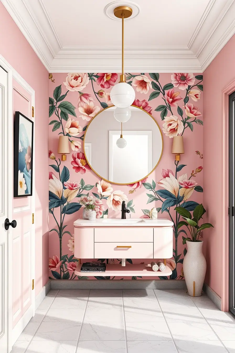 Moisture-resistant vinyl wallpaper is ideal for humid environments. Pairing bold wallpaper with neutral tiles or flooring maintains visual balance. A floral accent wall behind the vanity can become the room’s centerpiece.