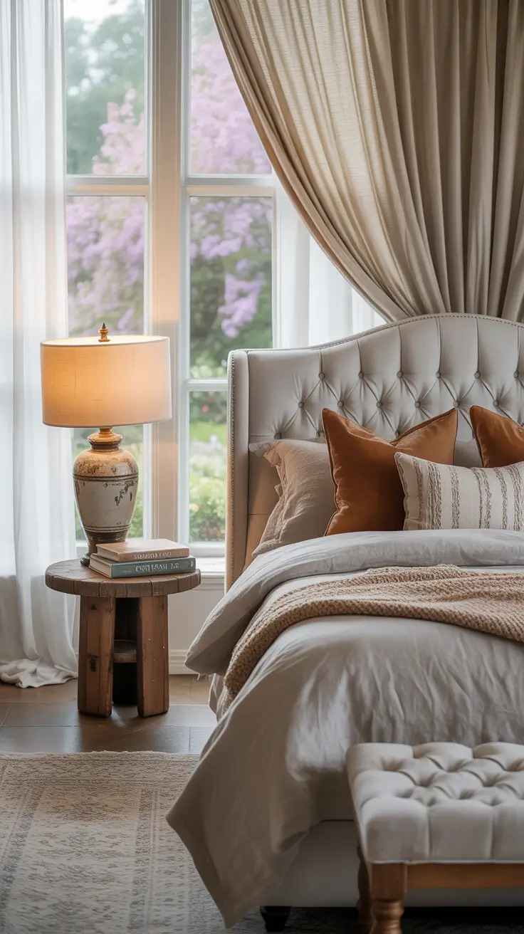 For furnishings, consider a wrought iron or dark walnut bed frame upholstered in floral cotton fabrics. Layer the bed with beige or cream quilts accented by ivory tones to maintain harmony. Complement the look with natural wood side tables and lamps featuring linen shades. Small details like cinnamon-colored throws or caramel upholstery accents ground the space beautifully.
