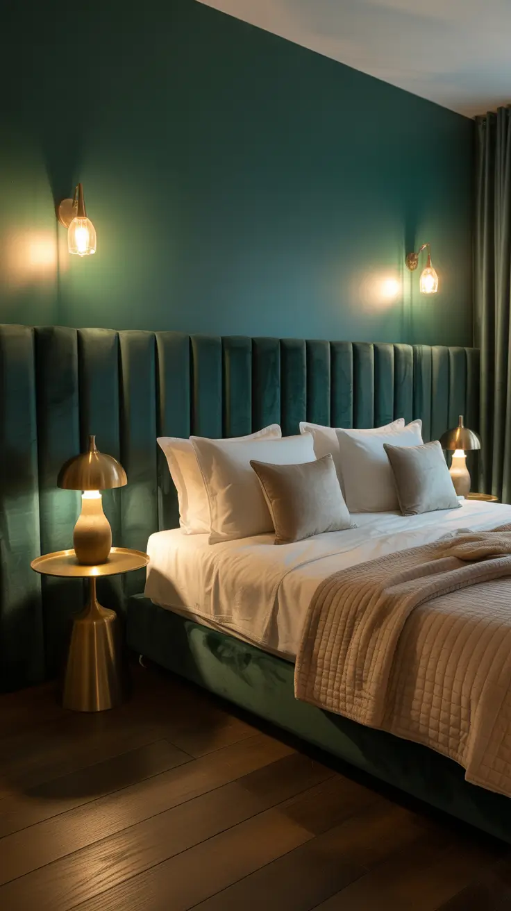 Dark green hues transform bedrooms into intimate, stylish sanctuaries. The 2026 trend combines textured walls, sumptuous velvet furnishings, and warm metallic accents, creating a rich yet inviting atmosphere suitable for master or guest rooms, even in smaller spaces.